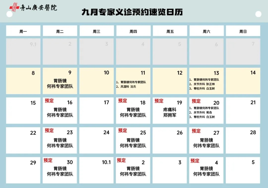 每月专家义诊预约速览日历