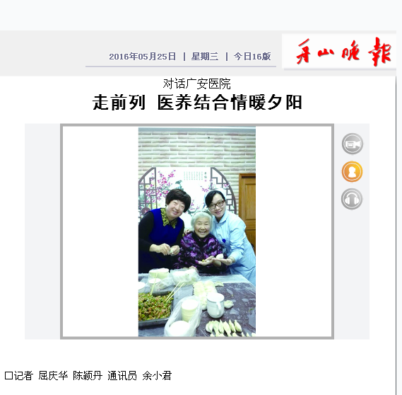 广安的“医养结合”模式开启了我市保健康复和老年医疗领域的新探索,让老人“老有所医”且“老有所依”,有力推动了我市老龄事业的发展。