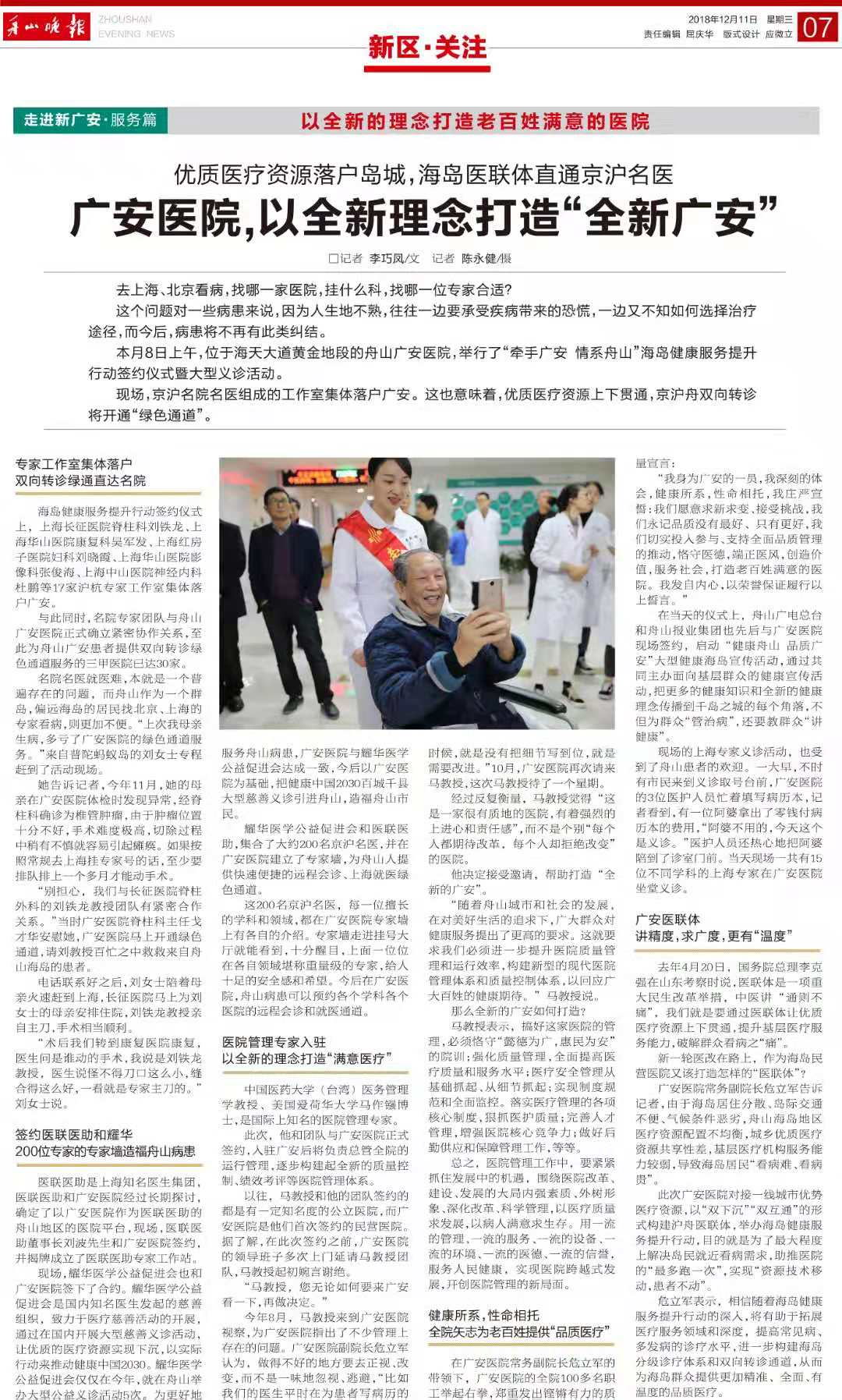 本月8日上午,位于海天大道黄金地段的舟山广安医院,举行了“牵手广安 情系舟山,海岛健康服务提升行动签约仪式大型义诊活动。