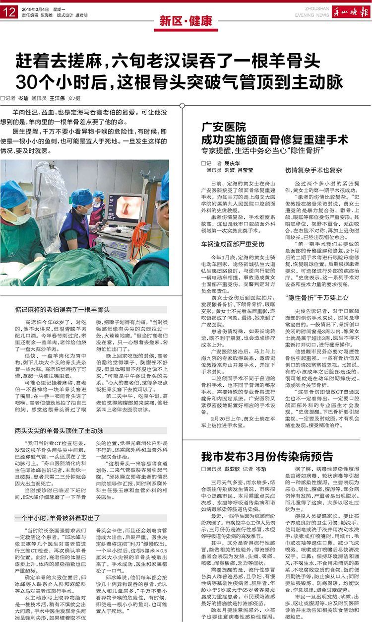 日前,定海的黄女士在舟山广安医院接受了颌面骨修复重建手术,为其主刀的是上海交大医学院附属第九人民医院口腔颌面外科的史俊教授。