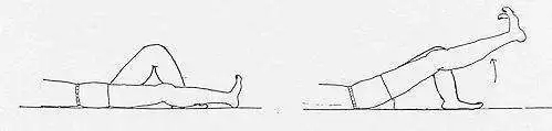 ①直腿抬高训练:患者仰卧位,行直腿抬高训练,将健侧腿弯曲,将患肢完全伸直。然后把患肢抬高,抬到脚跟离床面15厘米的位置。要求抬腿时股四头肌绷紧,保持膝关节细绷直。患肢抬起后保持在15厘米的高度不动,每次悬空10s后再缓慢放下。将腿放在床上休息片刻.之后继续进行第二次真抬练习。反复练习,每天做3~4组,每组20次,每组之间体息30秒。