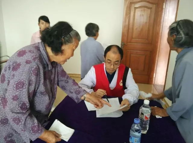 取药处的志愿者一直笑对村民,把药分派到村民手中,还嘱咐他们按时吃药以及注意事项。